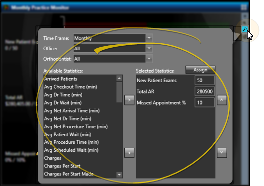 While viewing the Practice Monitor settings window, click the Assign button, then select the Edge Cloud users to share with. When those users open their Practice Monitor widget, their statistic settings will update to match yours. This does not change their time frame, office, or orthodontist settings.