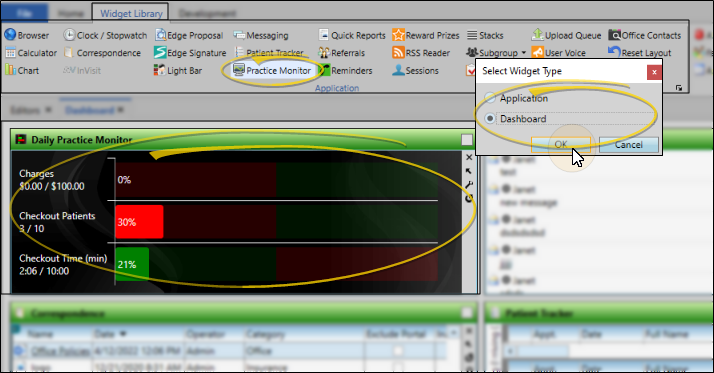 From the Application section of the Widget Library ribbon bar, choose the Practice Monitor widget, and select whether to open it as a Dashboard or Application widget.