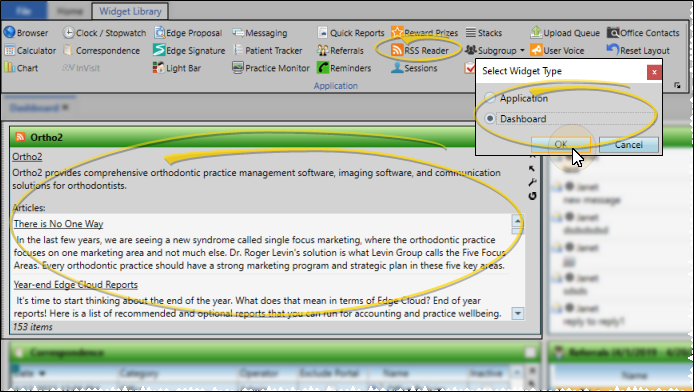 From the Application section of the Widget Library ribbon bar, choose the RSS Reader widget, and select whether to open it as a Dashboard or Application widget.