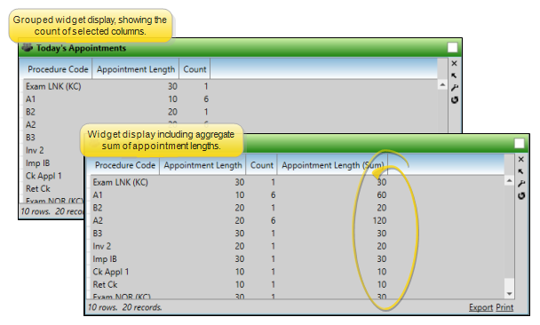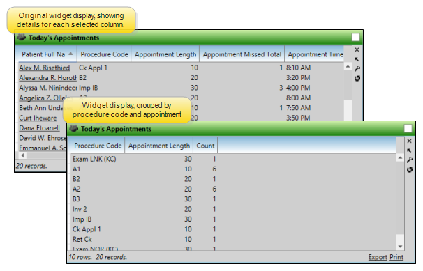 You can optionally group the data by any field you have selected to display, so that the widget shows you only the grouped columns and total number for each grouping, rather than individual data.