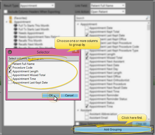Apply Grouping - Click Add Grouping at the bottom of the window, then select one or more columns to group the data by. Only columns you have chosen to display in the widget are available to you.
