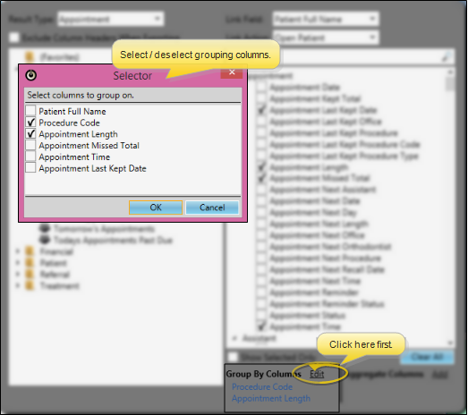 Remove Grouping - Return to the Settings window, and click Edit beside the Group Columns section of the window to either select different columns, or to remove grouping from the widget.