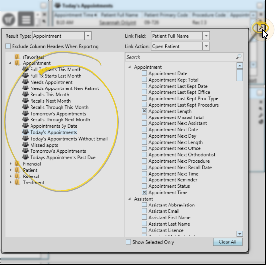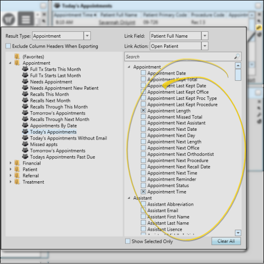 You can use the Search bar to look for the fields you want to include. You can also enable the Show Selected Only option at the bottom of the window to include only fields you have already chosen in the list, and click the Clear All button to disable all fields and start again.