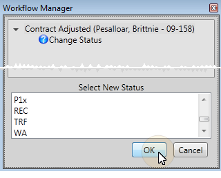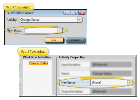 What Happens? - If you select a specific status in the activity properties, the status change happens automatically whenever the activity is triggered by a workflow. If you set the property to None, the Workflow Manager window will prompt you for the status as the activity is being processed.