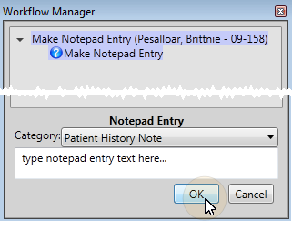 What Happens? - When this activity is triggered, the Workflow Manager window will prompt you for the category to use, and provide a space for you to type the text of the notepad entry. When you are finished, click Ok to process the activity as complete.