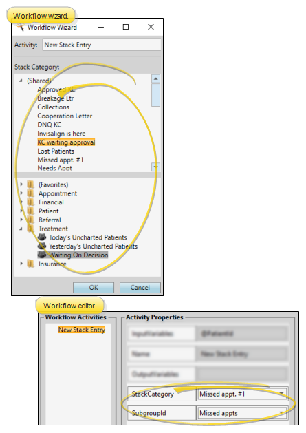 Stack Category - Use this property to select the category to use when adding a patient or a subgroup of patients to stacks via this workflow activity. When you use a wizard to add this activity to a workflow, your entire stacks widget appears in the window, with full functionality. When you add this activity via the Workflow editor, category names appear for your selection, but no stacks functionality is available. If you select None as the category from the Workflow editor, this activity will not function when the workflow is triggered.