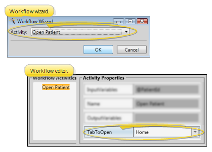 Use the Open Patient workflow activity to open the patient folder whenever the activity is triggered by a workflow. Use the Workflow editor to select the tab you want to open when this activity is triggered.