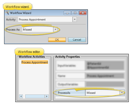 Process As- Use this property to select how you want the appointment flagged when this activity is triggered by a workflow. You may select the process the appointment as Made, Kept, Missed, Deleted, Changed, or Canceled; or, choose to send the patient to the Scheduler Bar, or choose All to process all of the patient's pending appointments.