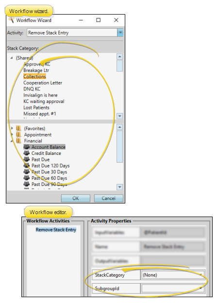 Stack Category - Use this property to select the category to use when removing a patient or a subgroup of patients from a stack via this workflow activity. When you use a wizard to add this activity to a workflow, your entire stacks widget appears in the window, with full functionality. When you add this activity via the Workflow editor, category names appear for your selection, but no stacks functionality is available. If you select None as the category from the Workflow editor, you will be able to select the category to remove the patient from when the workflow is triggered.