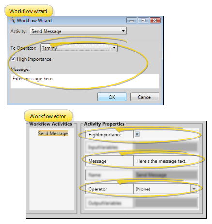 Message - Type the text of the message. If you have selected to send the message to a specific operator, you cannot change the message text once the activity has been triggered by a workflow. However, if the Operator property is None, you will be able to change the message text at the time you are selecting the recipients.