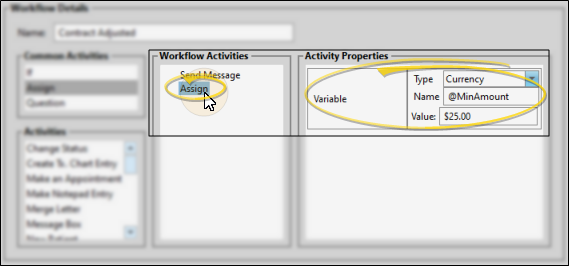 You can use the "Assign" element of the Workflow editor to create new variables, and assign values, or contents, to those variables to use within a specific workflow activity. Most often, "Assign" elements are used in conjunction with "If" conditional statements to evaluate patient data and assign an appropriate value according to the results of the evaluation.