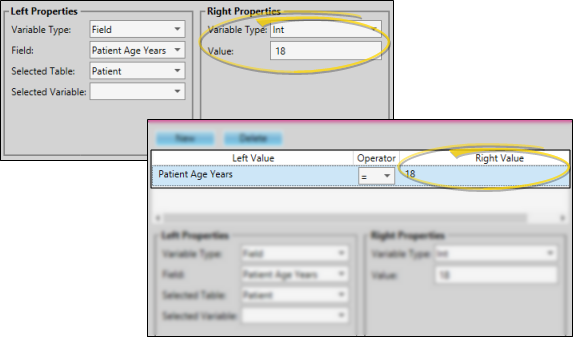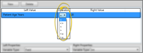 Use the Right Properties section at the bottom of the window to enter the value, or response you are looking to evaluate. Usually, the appropriate Variable Type is already selected, according to the type of data you chose at the left side of the screen, and you only need to enter the details that you want evaluated. For example, if you have selected "Patient Age - Years" at the left, the right side of the screen defaults to the variable type "Integer", and all you have to do is enter the age you want to evaluate, such as "18". Your selected value appears at the top of the window.