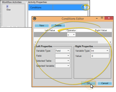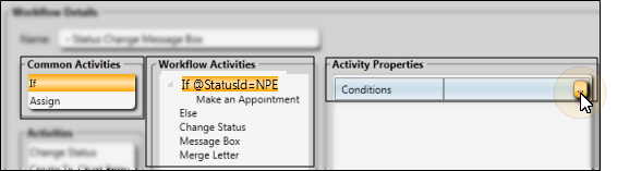 Click the "If" element in the Workflow Activities list to select it, then click [...] to open the Conditions Editor window.
